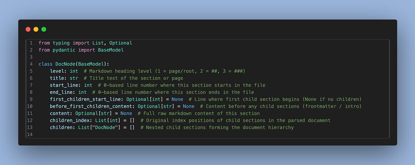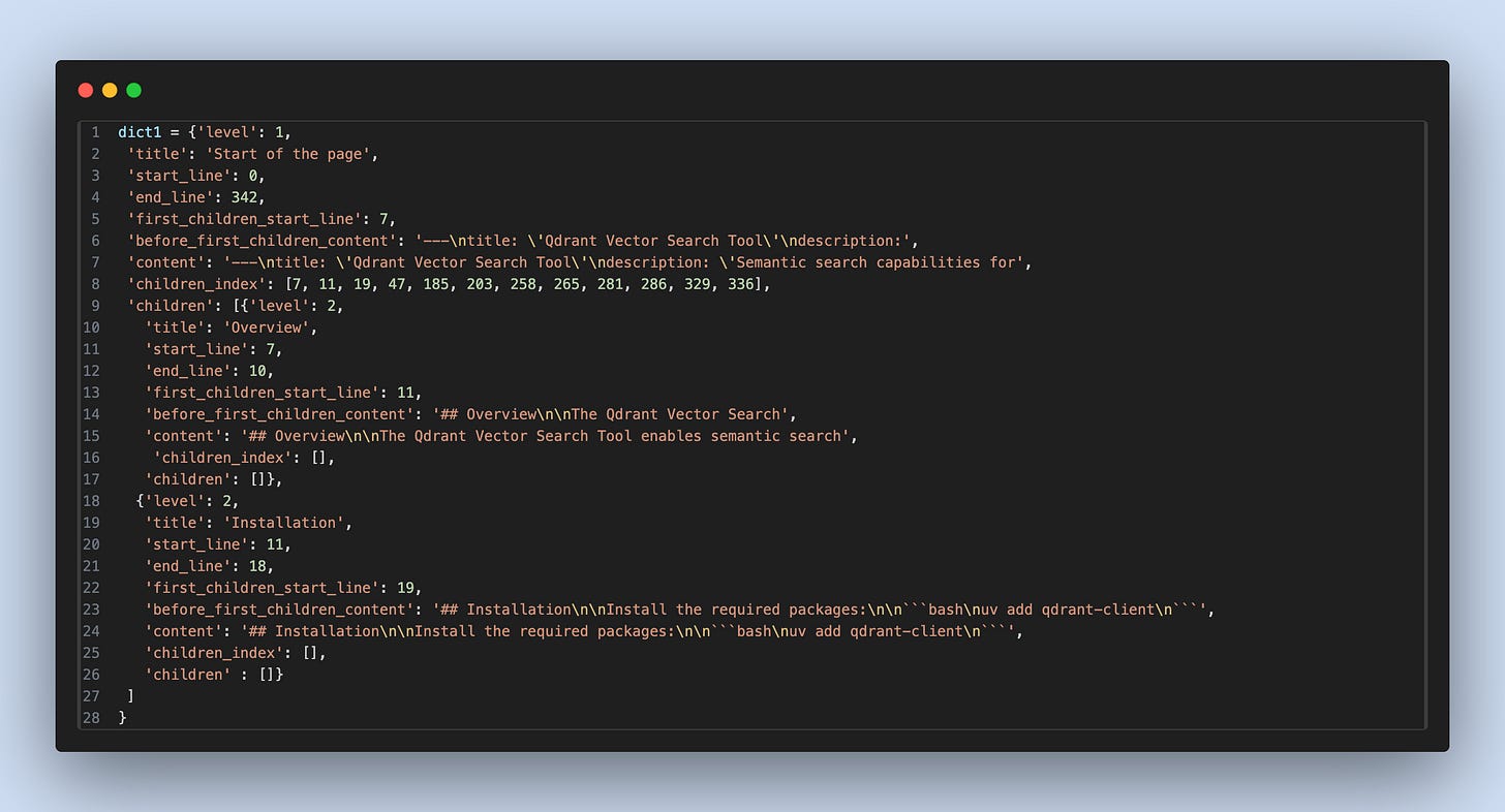The next challenge is locating the exact section that needs to be modified. For this, we reuse the indexing logic built at the very beginning. Using the levels provided by the Documentation Change Analyzer agent, we filter the relevant sections. Here, we apply a subset of the original logic and present the resulting structure in a clear, LLM-friendly format, such as: