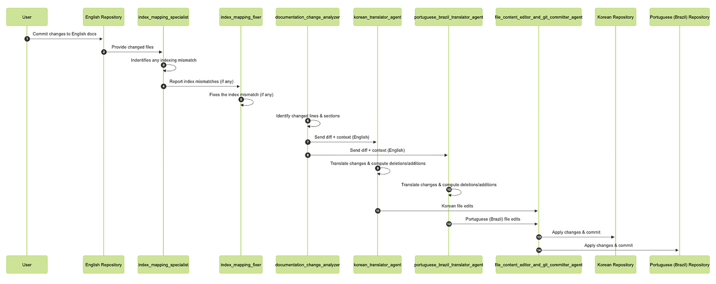 This agent’s responsibility is well defined: detect whether any new section has been added to the English documentation and ensure that the same section exists in the corresponding Korean and Portuguese (Brazil) documentation.